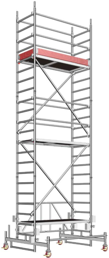 Fahrbares Gerüst, Arbeitsfläche 0,75x1,8m (bis 200kg), Arbeitshöhe von 1,7m bis 7,7m, in verschiedenen Varianten aufbaubar nach Anleitung, höhenverstellbare Rollen,